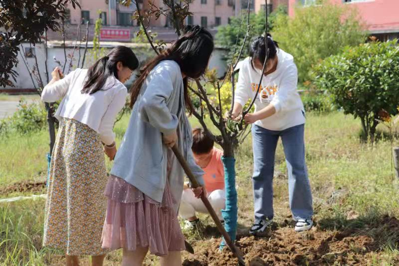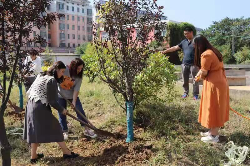 植樹現場一派緊張忙碌的勞動景象,黨員教師們一起揮鍬培土、夯實土層,現場分工明確,有條不紊;黨員教師們個個熱情洋溢、干勁十足,以飽滿的熱情投入到活動中。
