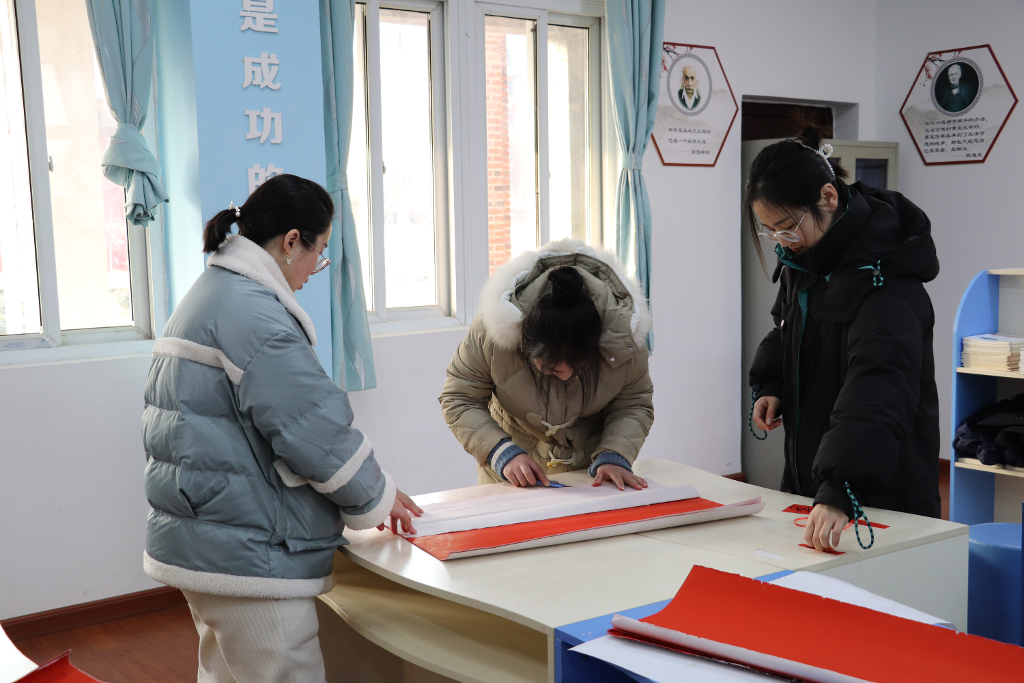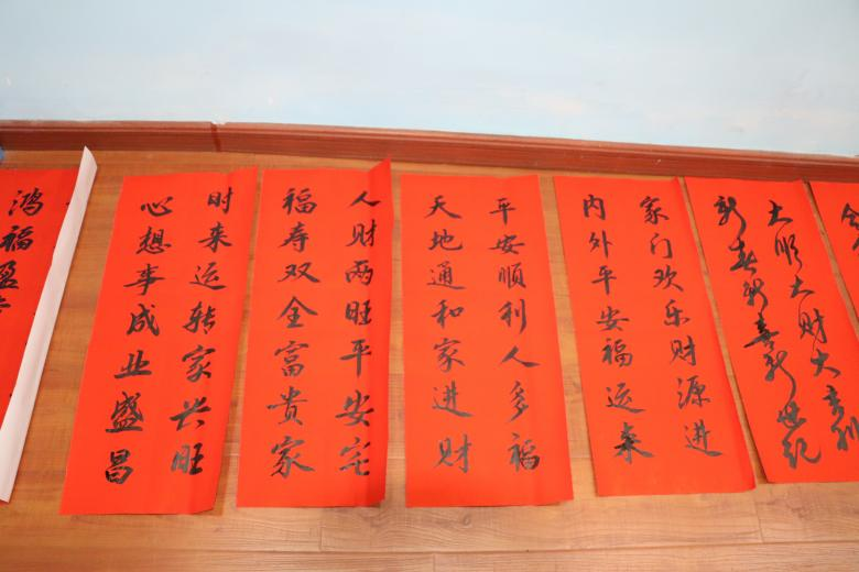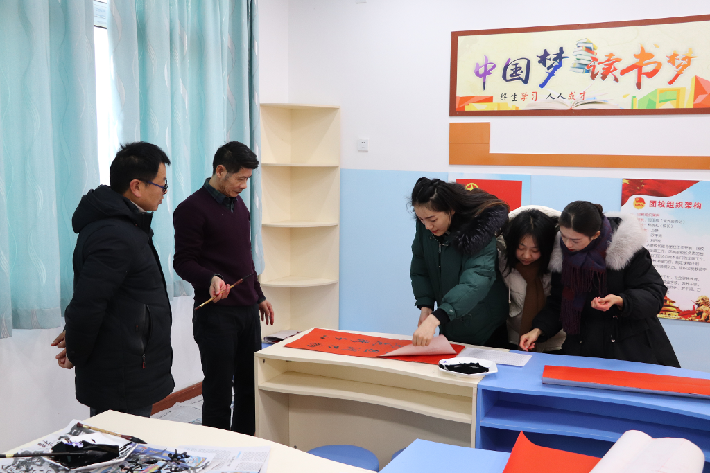 活動現場呈現出一派歡樂祥和的氣氛,聞訊趕來的教師和其他工作人員互相談論著各副春聯的寓意,熱鬧非凡。紅紅的春聯和張張的笑臉將活動現場烘托得格外喜慶,教職工們捧著散發著墨香,飽含著濃濃年味和美好祝福的春聯,個個喜笑顏開。在書寫春聯的同時,閆玉良書記為大家講授著書法的技巧。